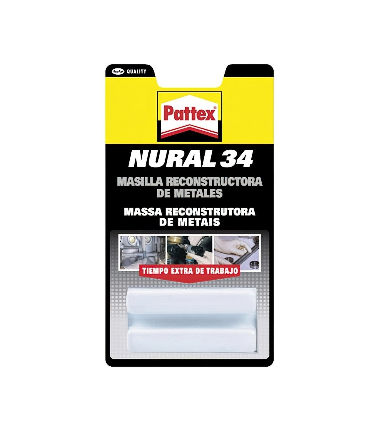 - Pattex Nural 34 pega, rellena, reconstruye y sella (grietas, agujeros, fisuras y Uniones) de forma permanente. Una vez endurecido puede ser lijado, pulido, taladrado, mecanizado y pintado.