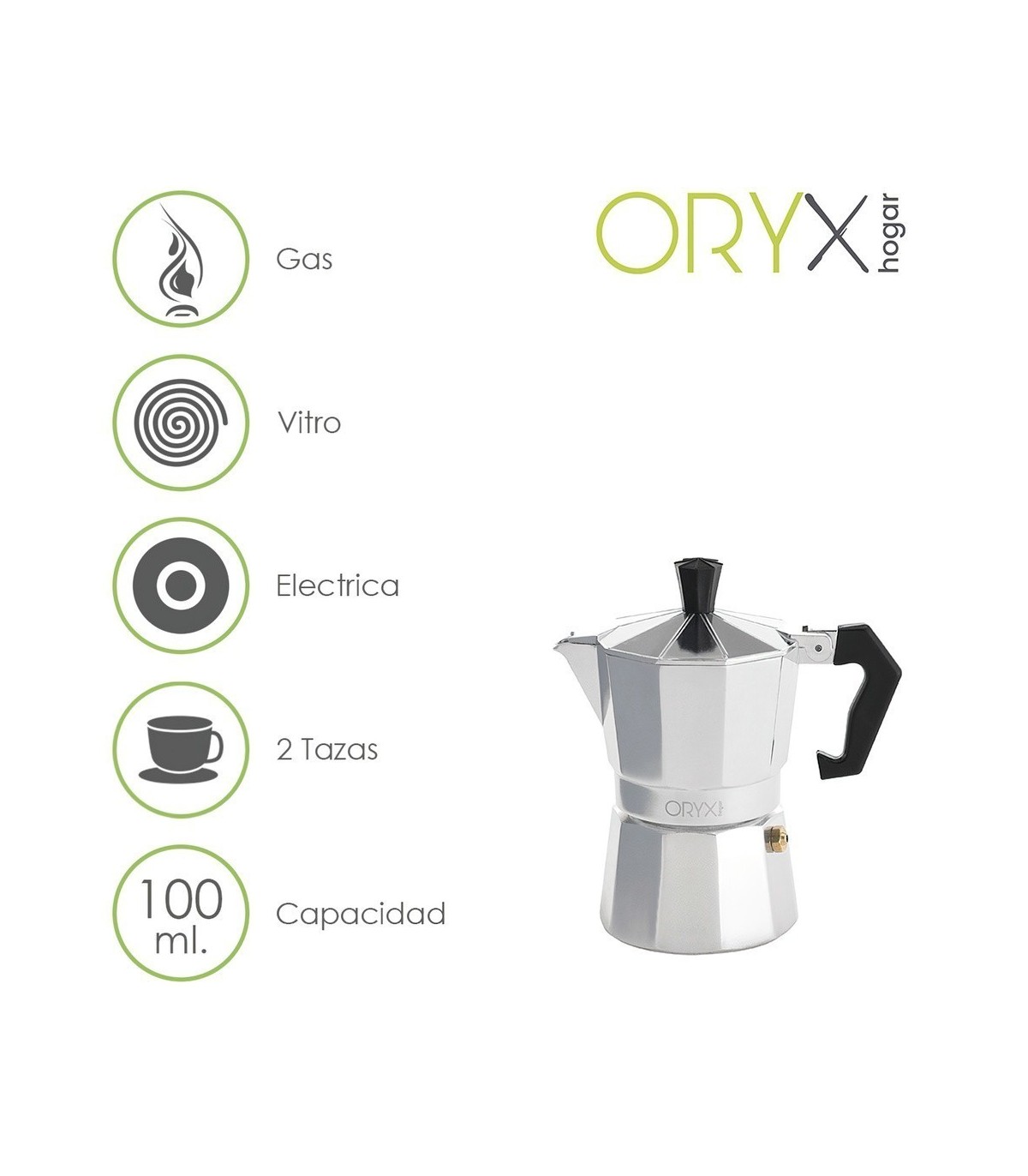 - Capacidad para 2 tazas de café (100 ml.)