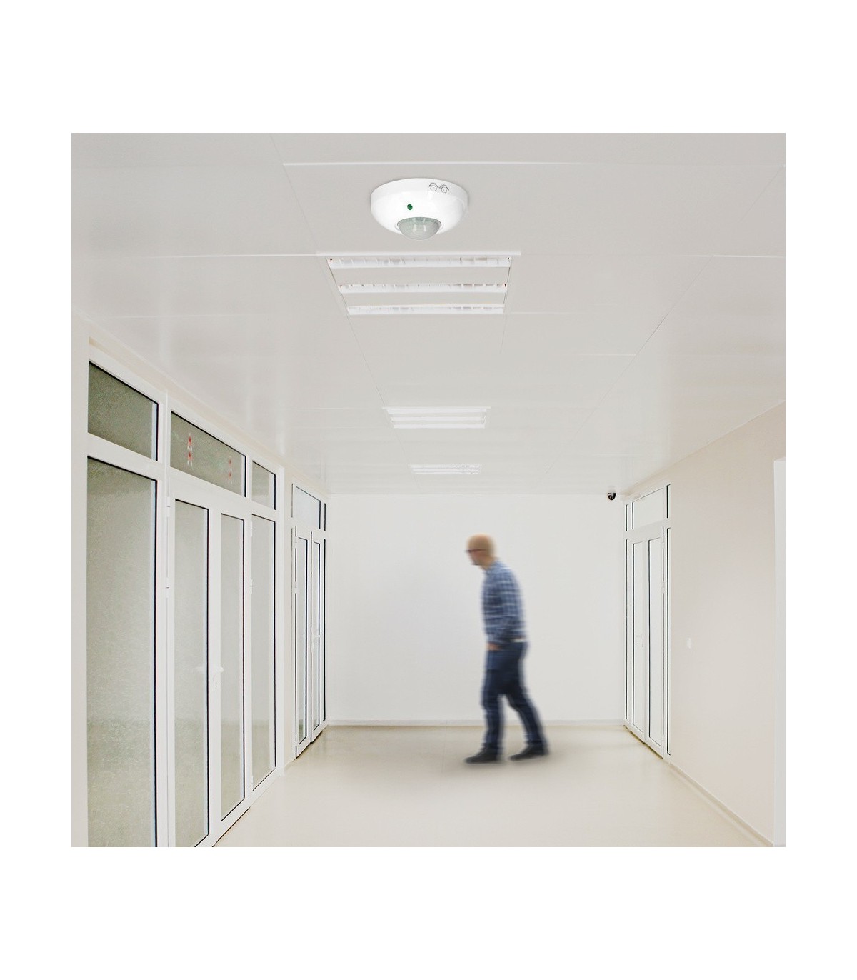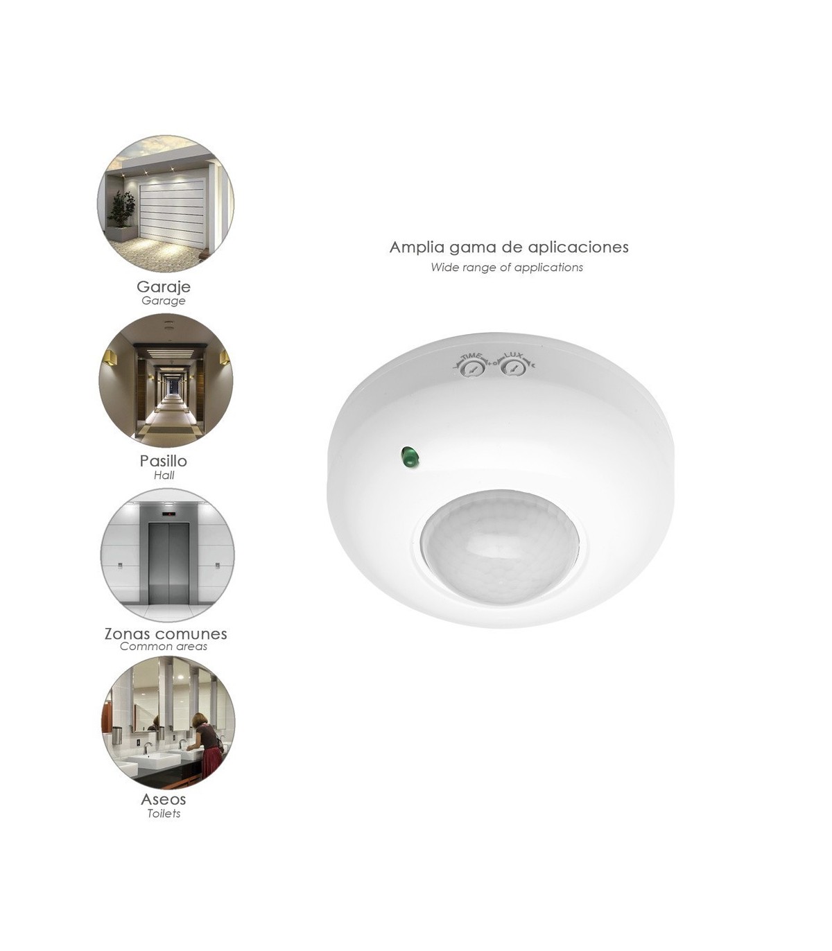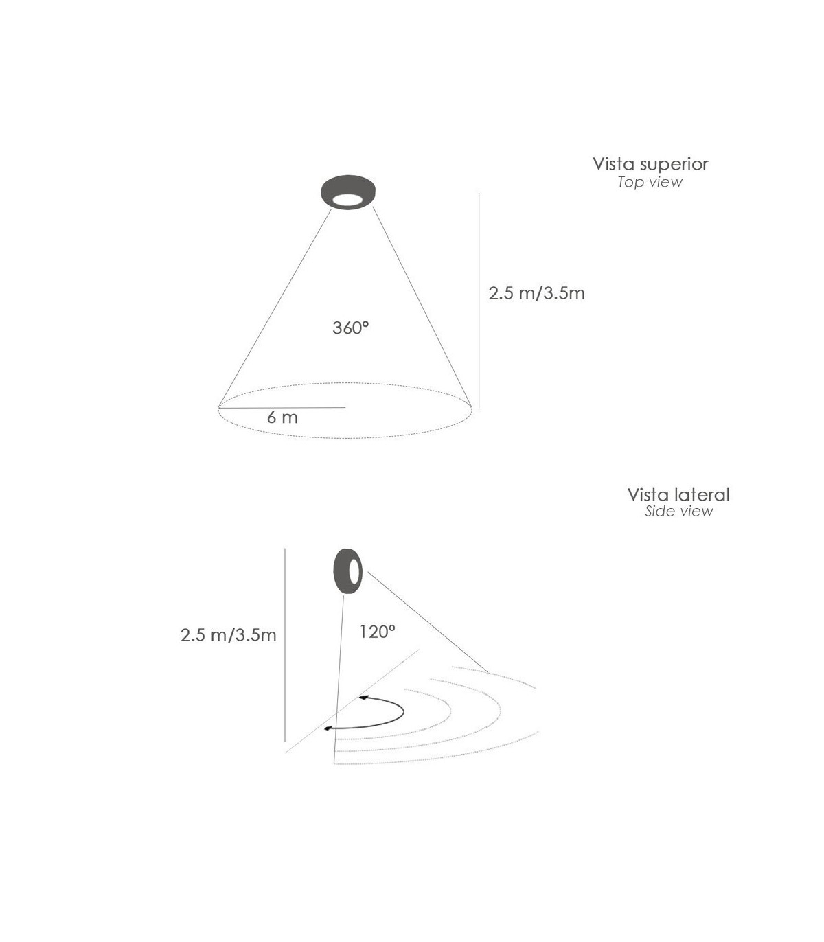 - Angulo de detección: 360º colocado en techo, 120º colocado en pared.