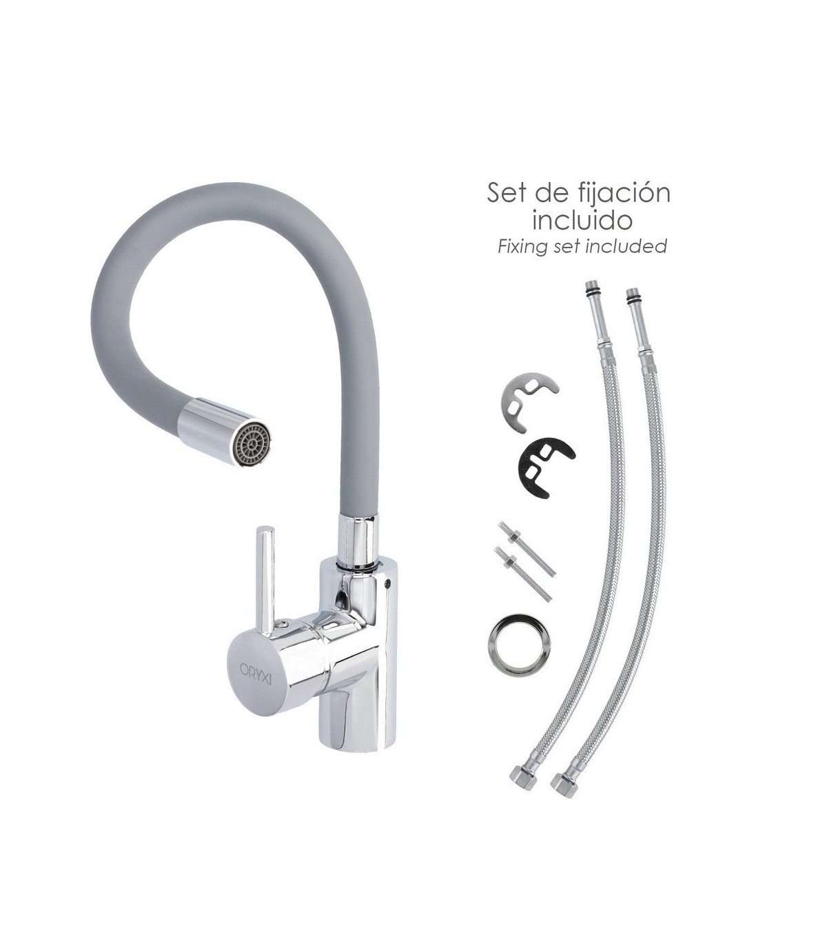 - Incluye set de fijación a la encimera y 2 latiguillos flexibles de 40 cm. de longitud.