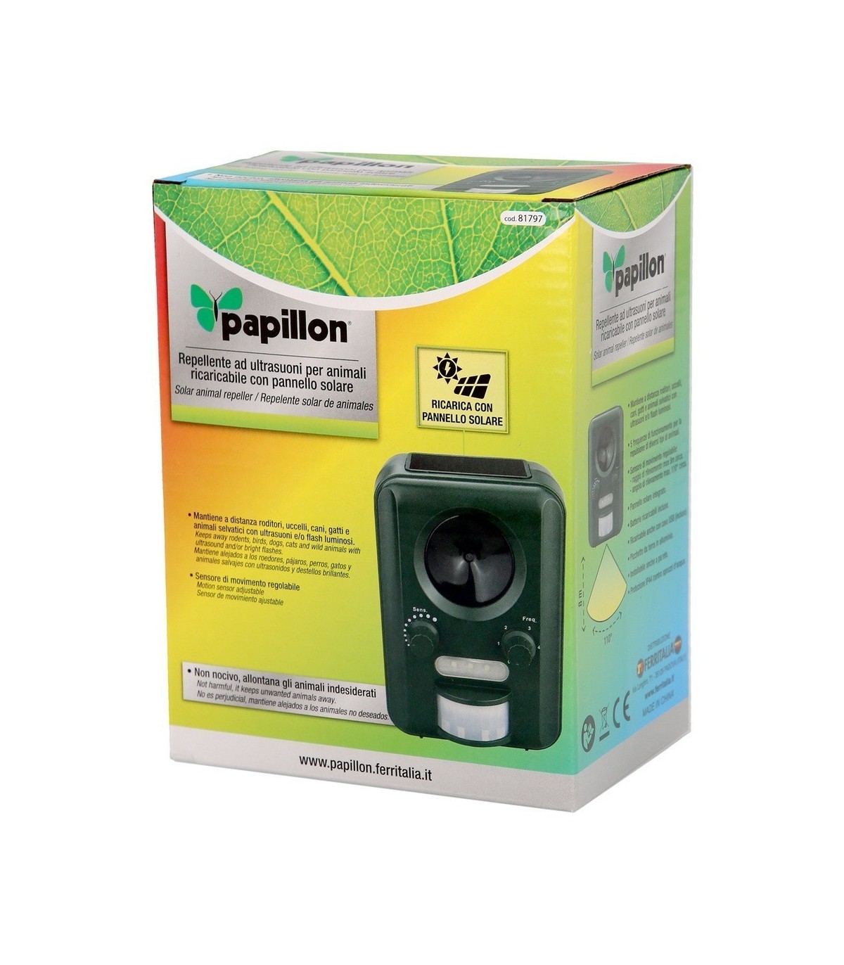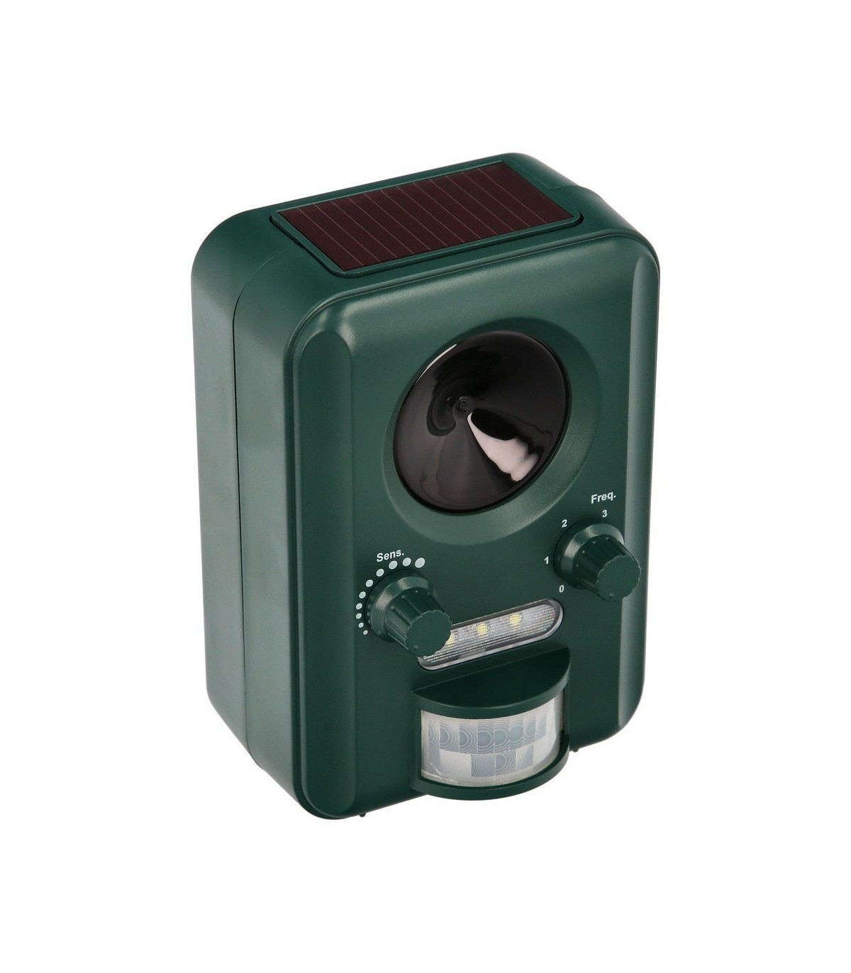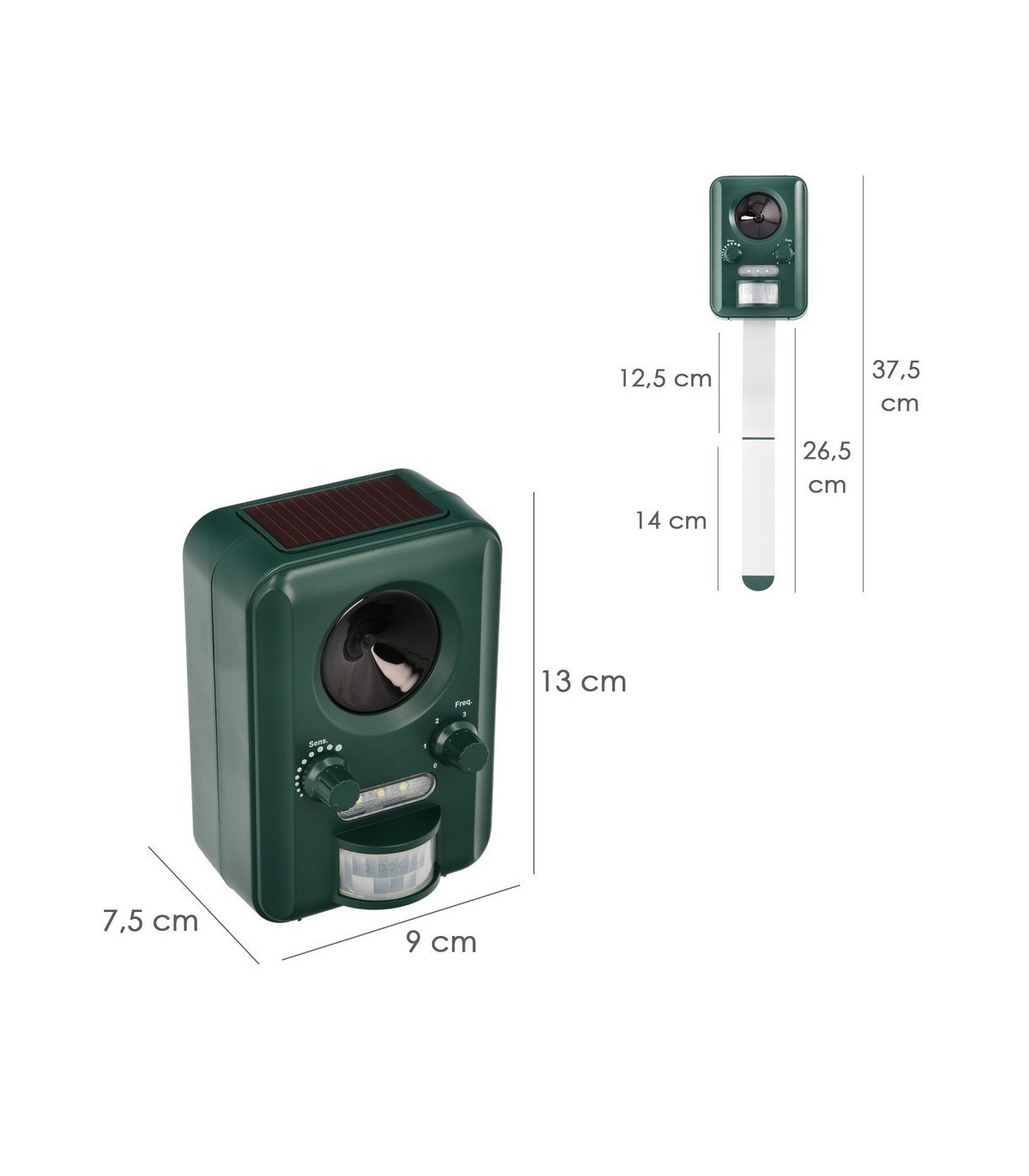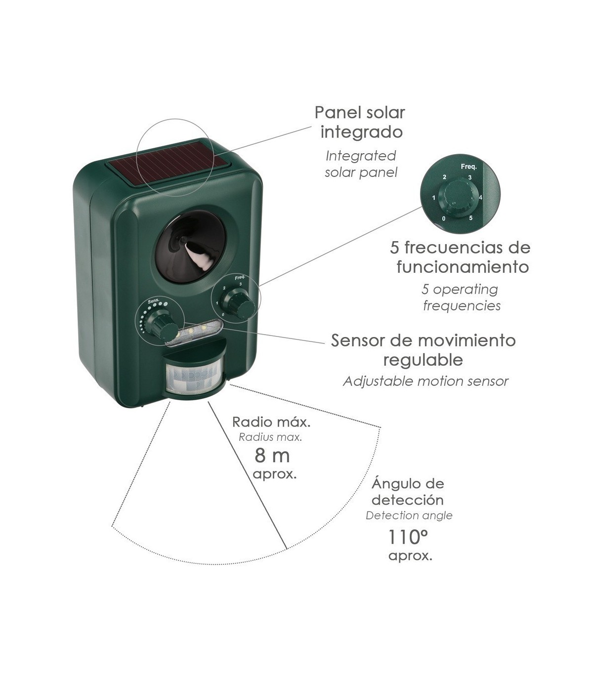 - Mantiene alejados a roedores, pájaros, perros, gatos y animales salvajes con ultrasonidos y destellos de luz.