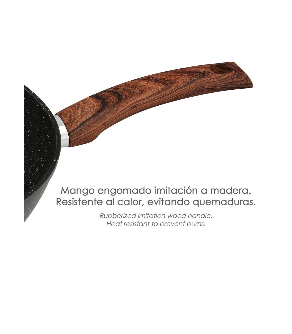 - Mango engomado imitación a madera. Resistente al calor. Se mantiene frío al tacto para evitar quemaduras.