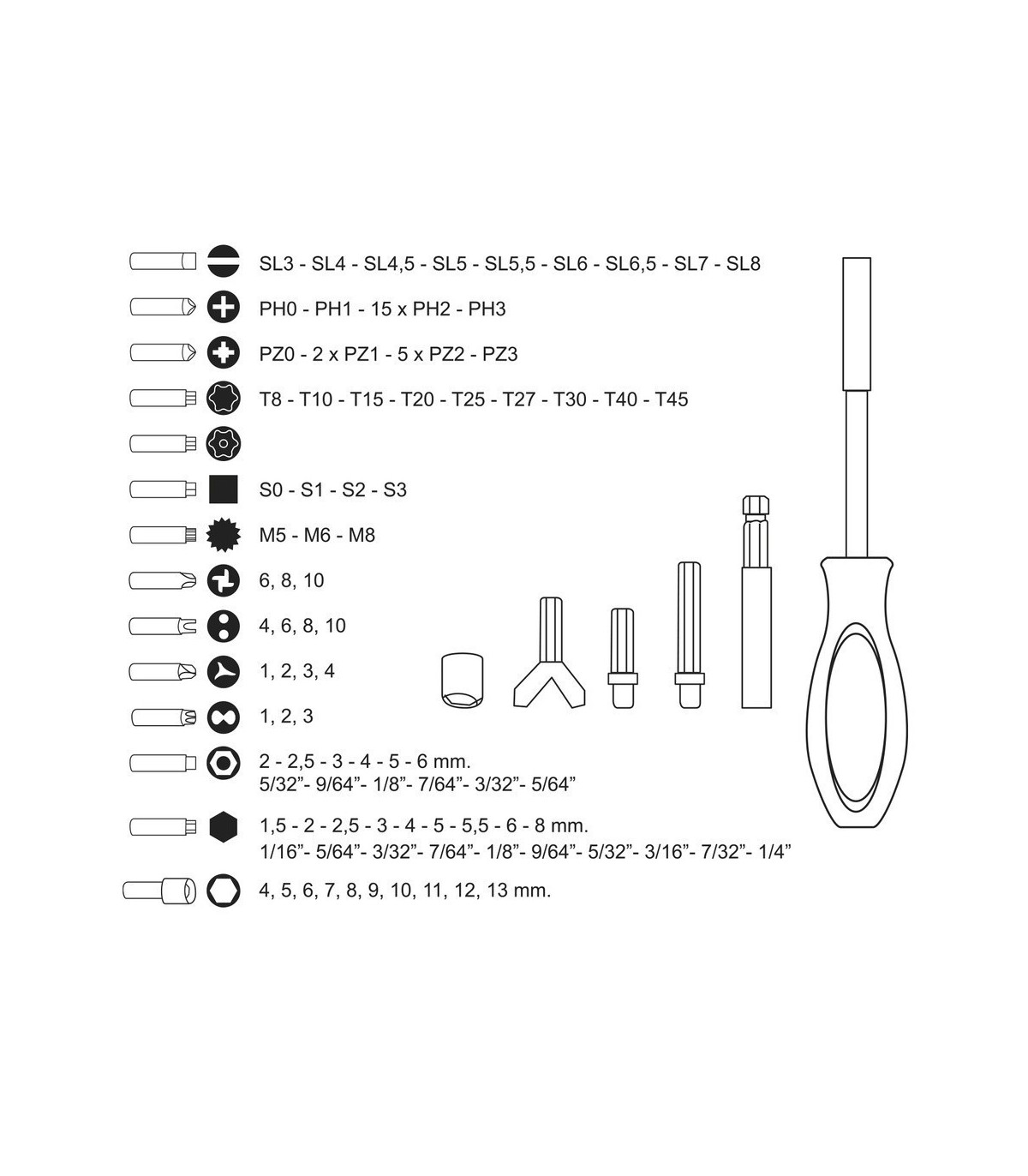 > Torx: 8 / 10 / 15 / 20 / 25 / 27 / 30 / 40 / 45