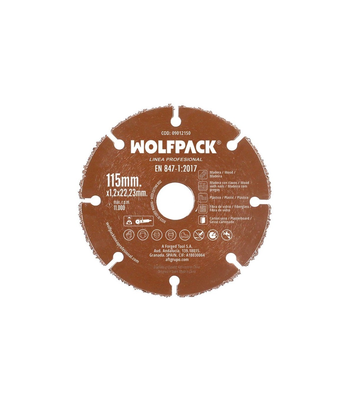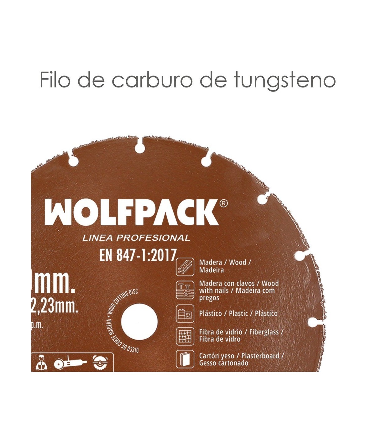 - Disco de corte con filo de carburo de tungsteno, ideal para cortar materiales como madera, plásticos, pladur, etc..