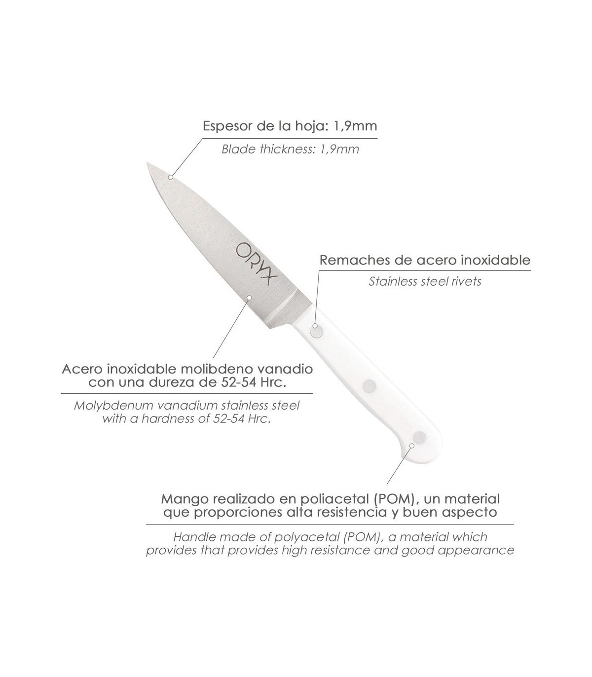 - Hoja realizada en acero inoxidable molibdeno vanadio con una dureza de 52-54 hrc.