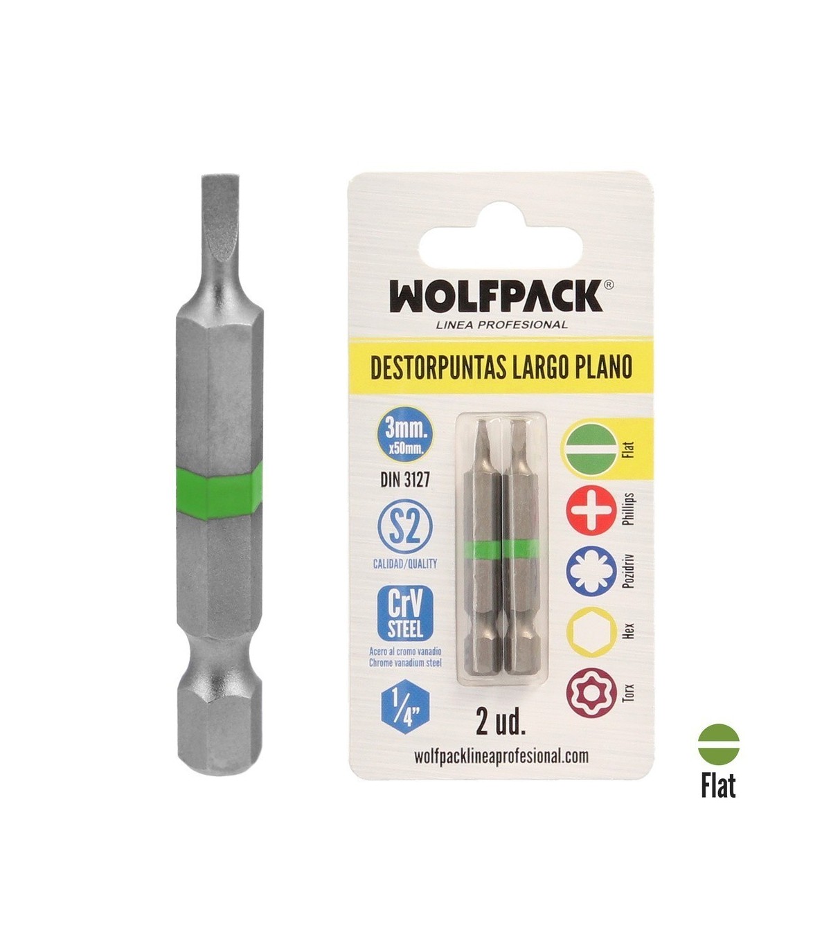Puntas Destornillador Largo Plano 3 mm. (2 Piezas). Acero S2 al Cromo Vanadio. Puntas Hexagonales, Destorpuntas,