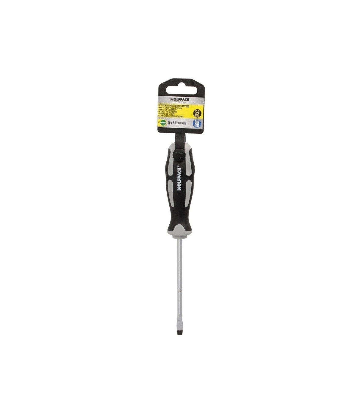 Destornillador Plano Estampado Acero S2 Mango TPR Bimaterial. Medida 1,0 x Diámetro 5,5 x 100 mm. DIN5265
