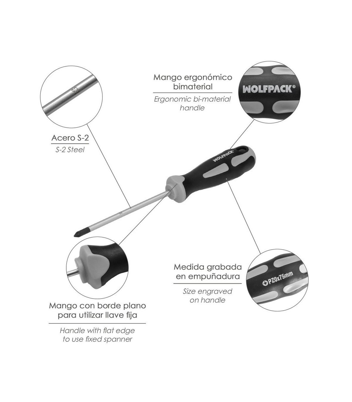 - Mango con acabado plano para poder usar una llave fija o una llave inglesa y aumentar la fuerza de apriete, también se puede como otro si fuera un mago T, introduciendo otro destornillador a través del orificio del mango.