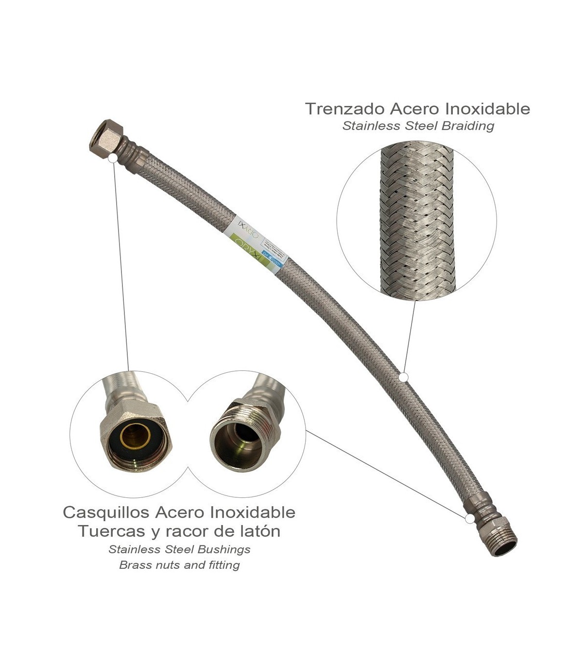 - Latiguillo Reforzado con trenzado y casquillos de acero Inoxidable.