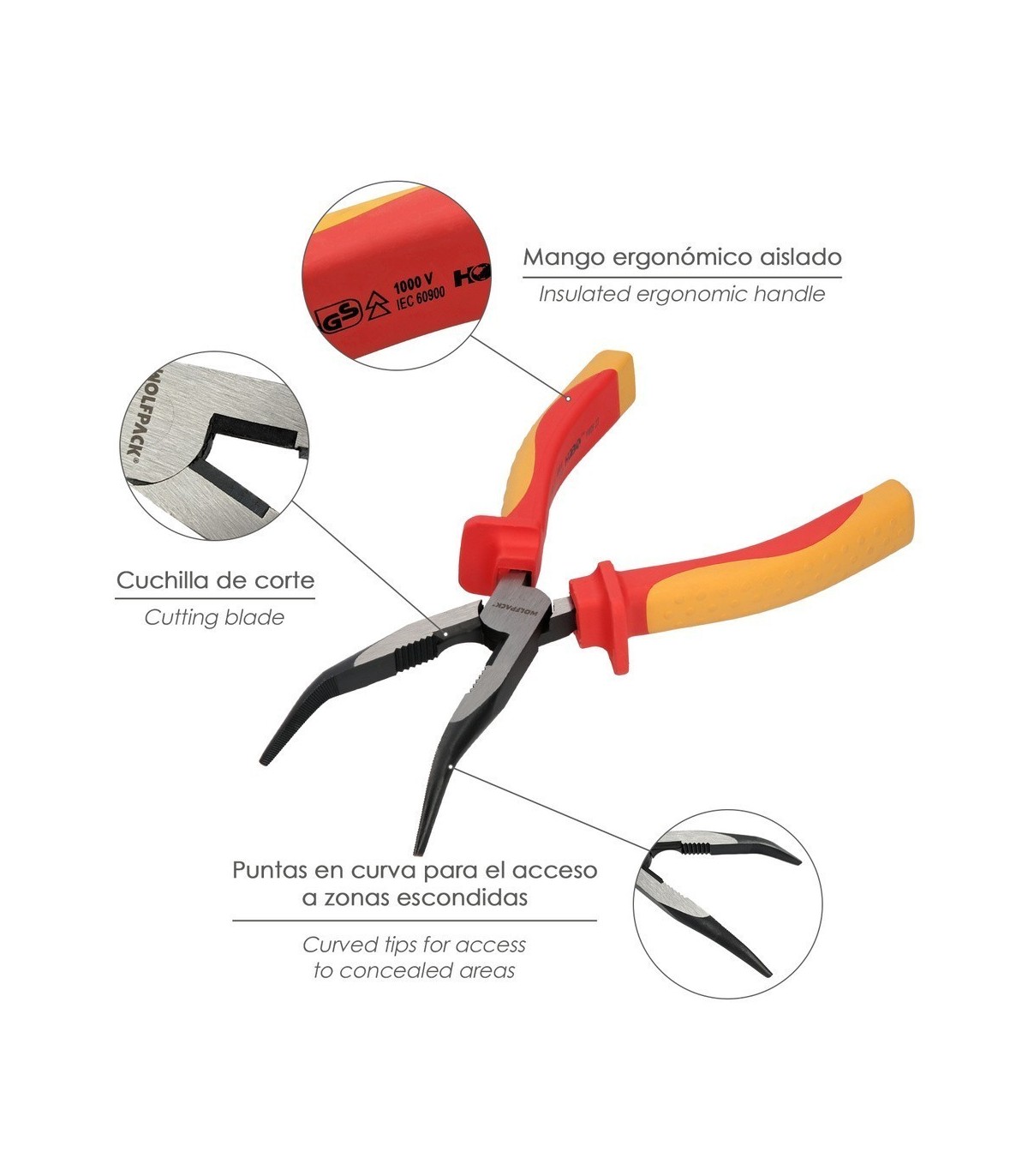 Alicates Boca Curva 200 mm. Mangos Aislados Acero Cromo Vanadio Pelacables, Corta Cables, Pelador Cables