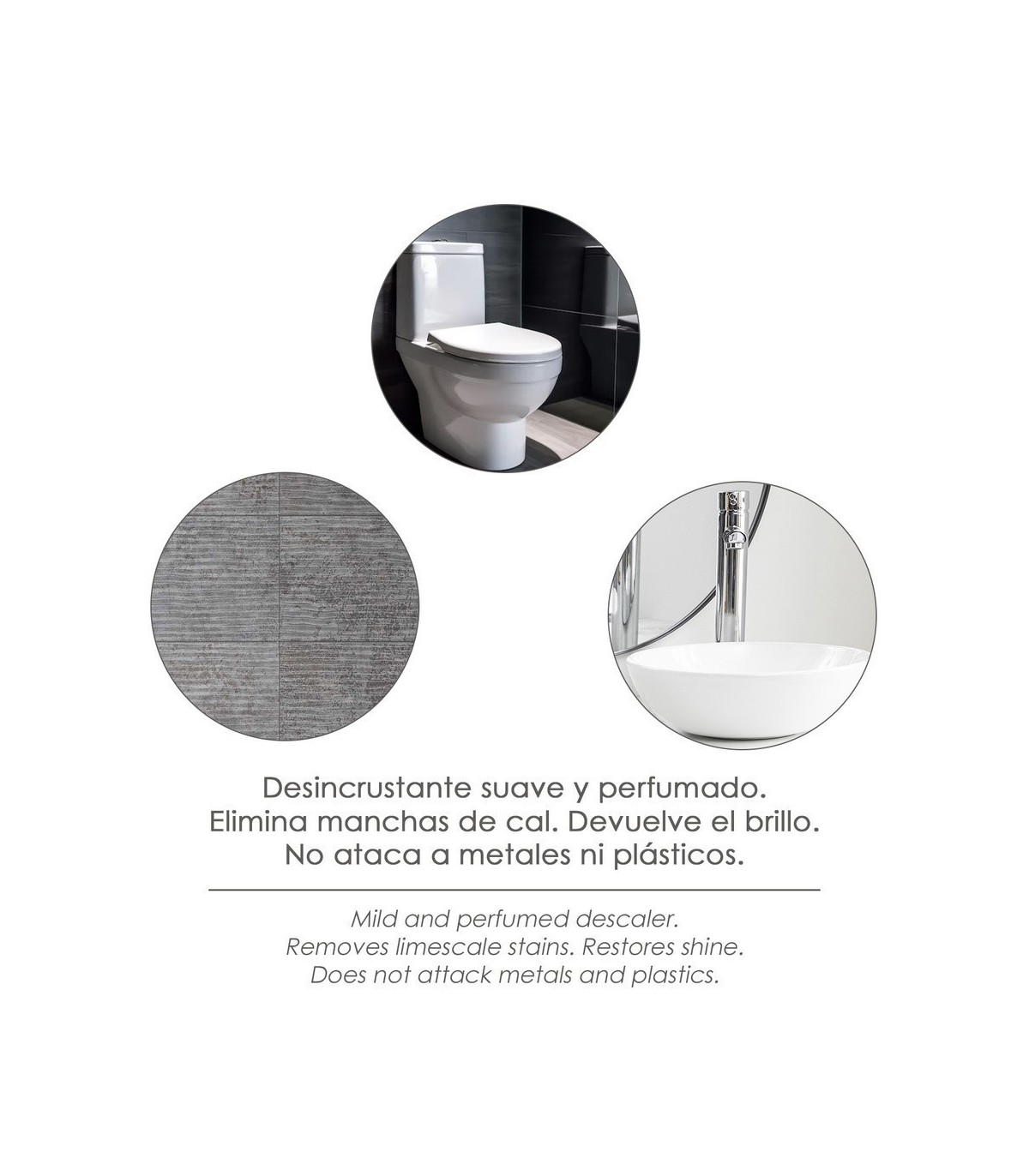 - Desincrustante suave y perfumado para el cuidado diario de los sanitarios, griferías y alicatados del baño, indicado para eliminar las antiestéticas manchas de cal.