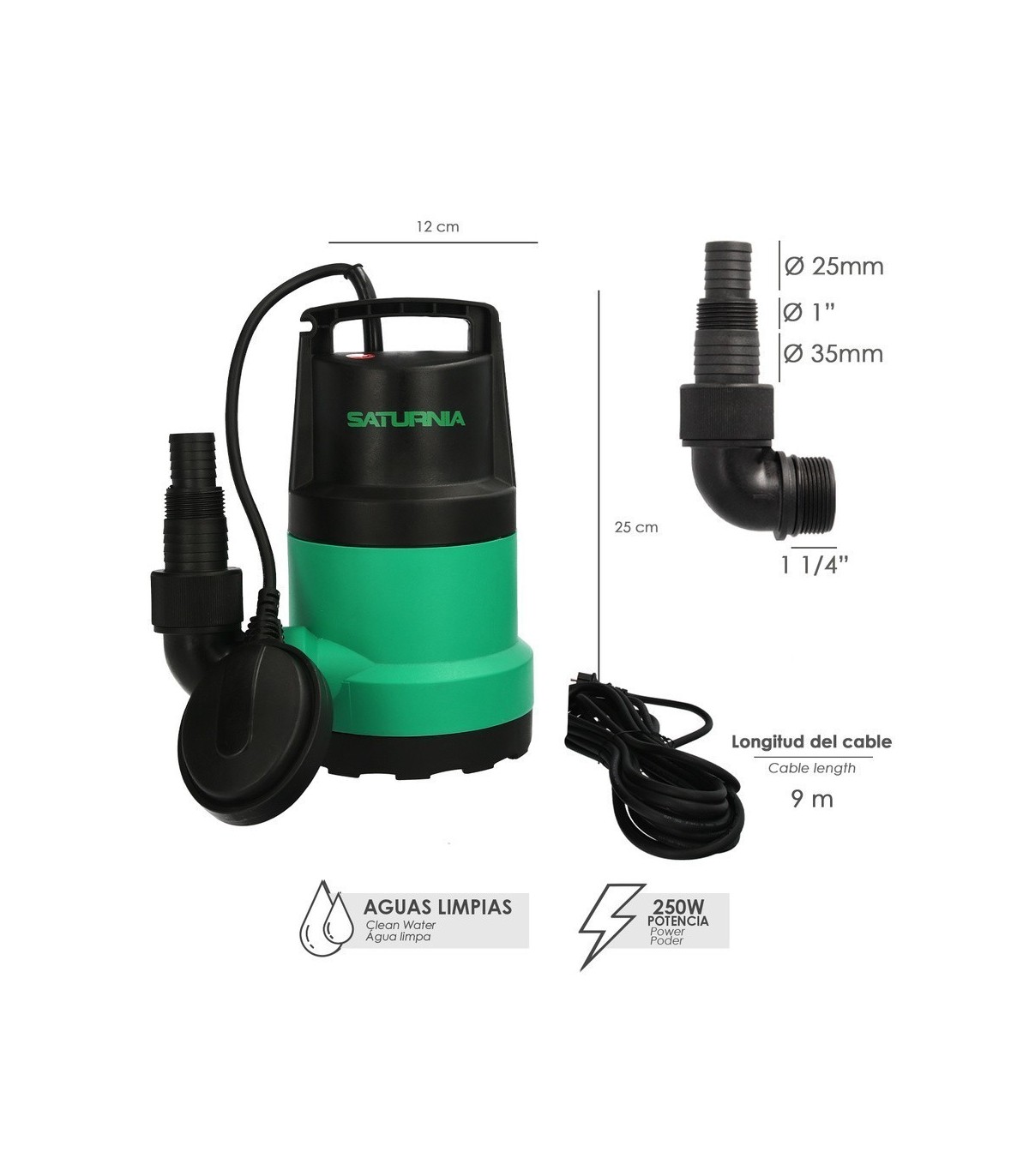 - Con flotador de activación del agua, permite que la bomba se active y desactive según el nivel del agua.