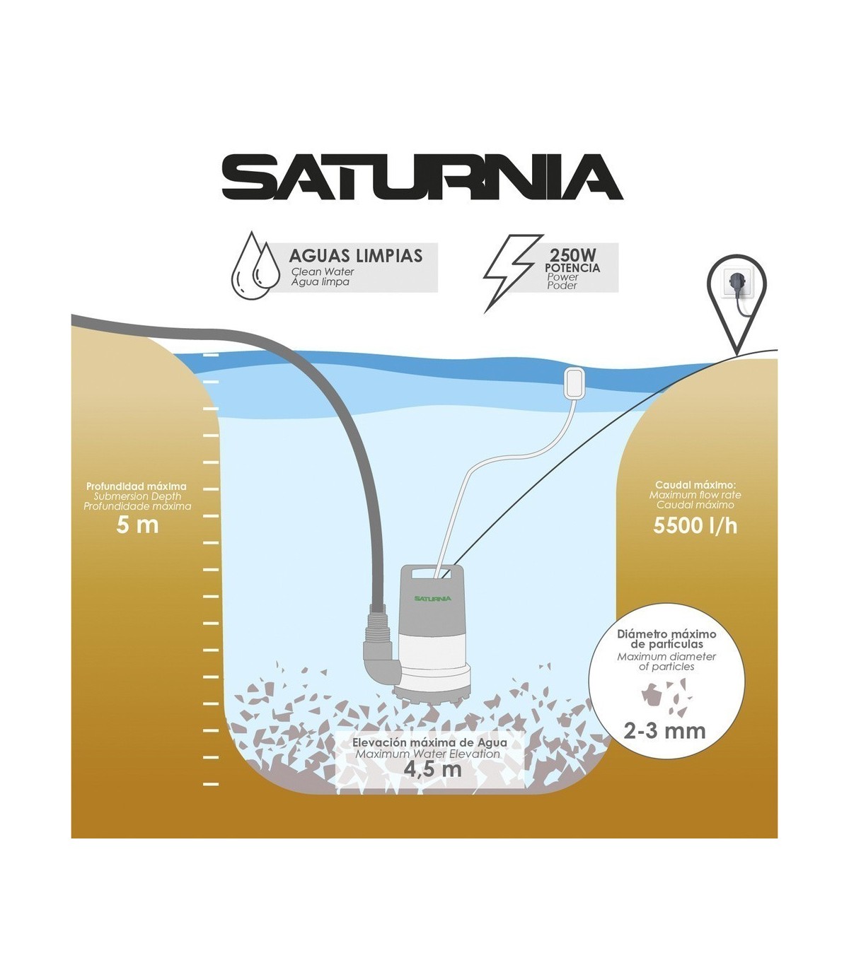 Bomba Aguas Limpias Sumergible 250 Watt. 5.500 lts/hora, Profundidad 5 Mts, Elevación 4,5 mts. Diámetro 2-3 mm.