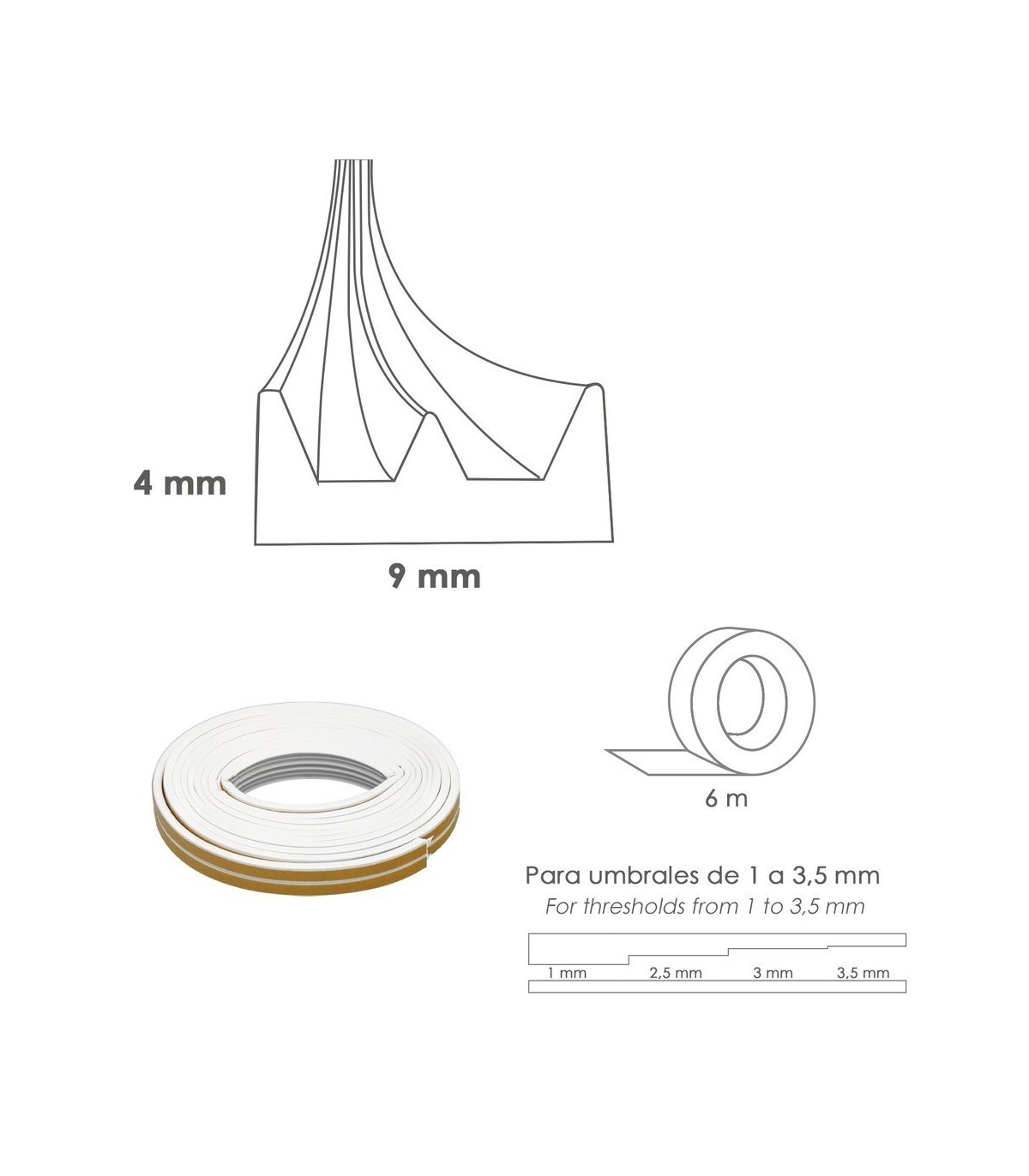 Burlete Caucho Blanco Rollo 6 Metros x 9 mm. Sellador Ventanas y Puertas. Aísla Del Ruido. Para Umbrales de 1 A 3,5 mm.
