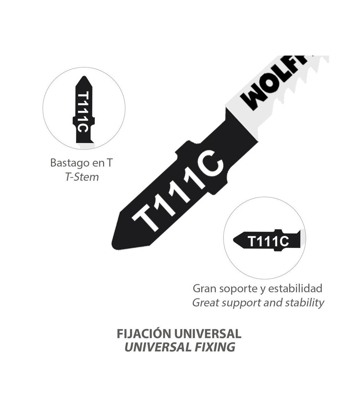 - vástago en forma de T, compatible con la mayoría de modelos de sierra de calar.