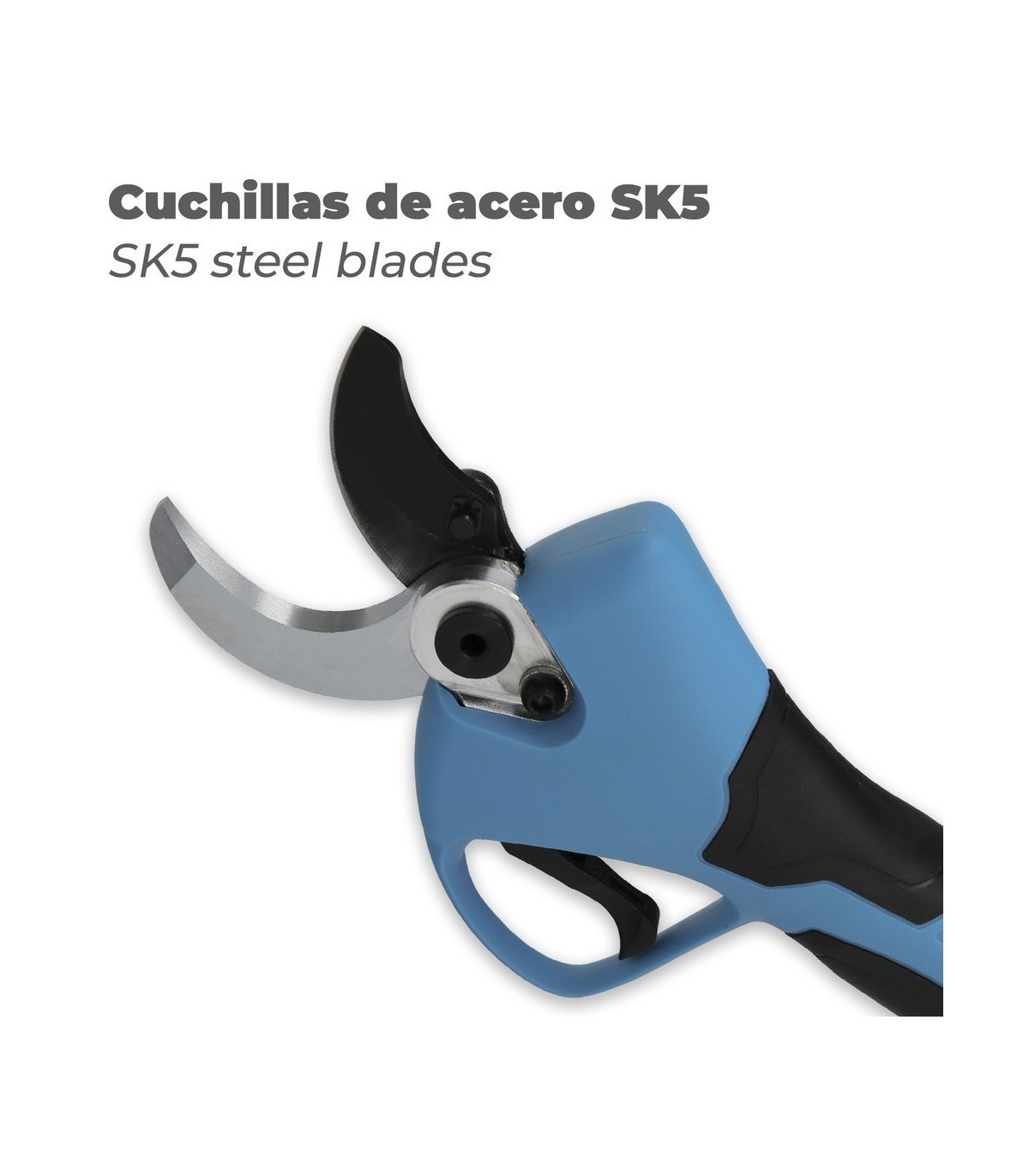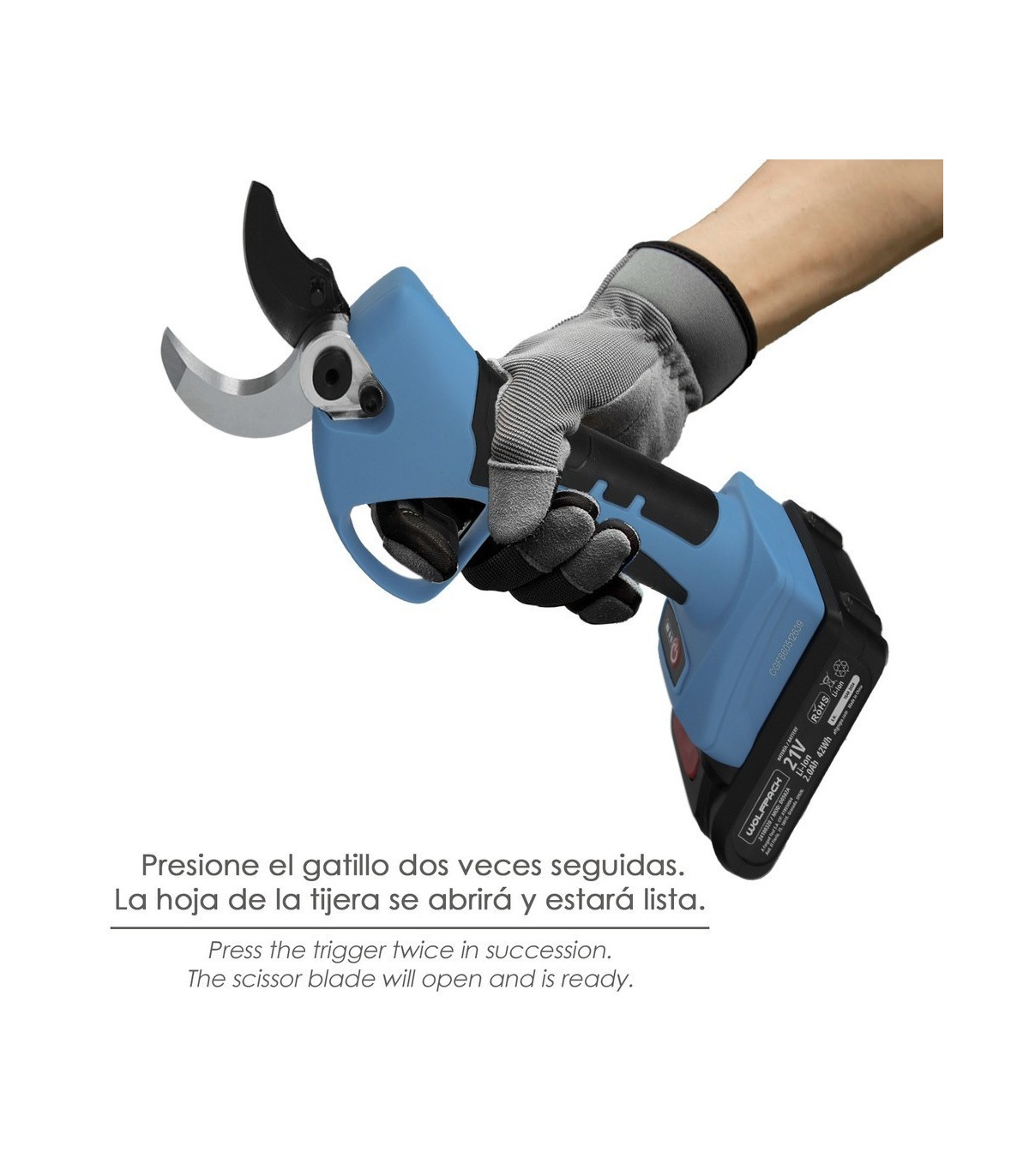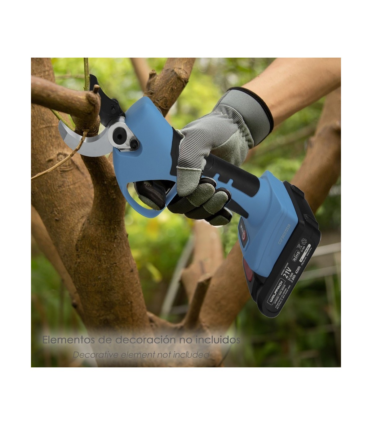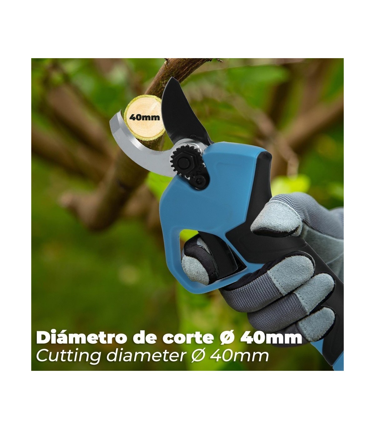La tijera de podar a batería 21V/2Ah es una tijera potente con 1050W asegura el corte en ramas gruesas de hasta 40 mm, a diferencia de otras tijeras más económicas, esta destaca por su potencia, facilitando el trabajo en huertos, viñedos y jardines.