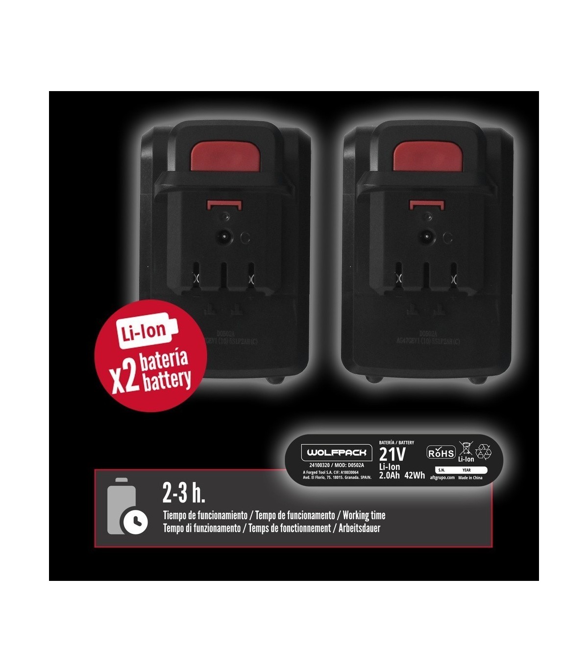 Incluye dos baterías de litio de 2.0Ah, proporcionando una autonomía de 2 a 3 horas por batería. Esto permite trabajar de manera continua sin interrupciones, optimizando el tiempo y aumentando la productividad.