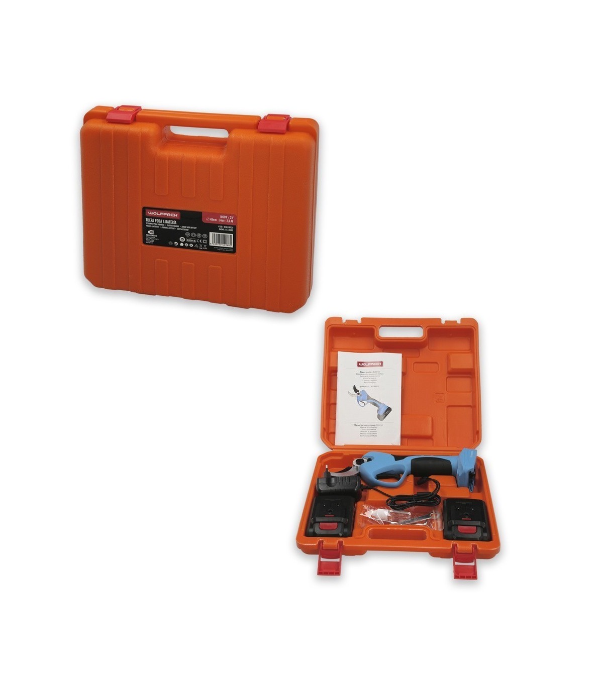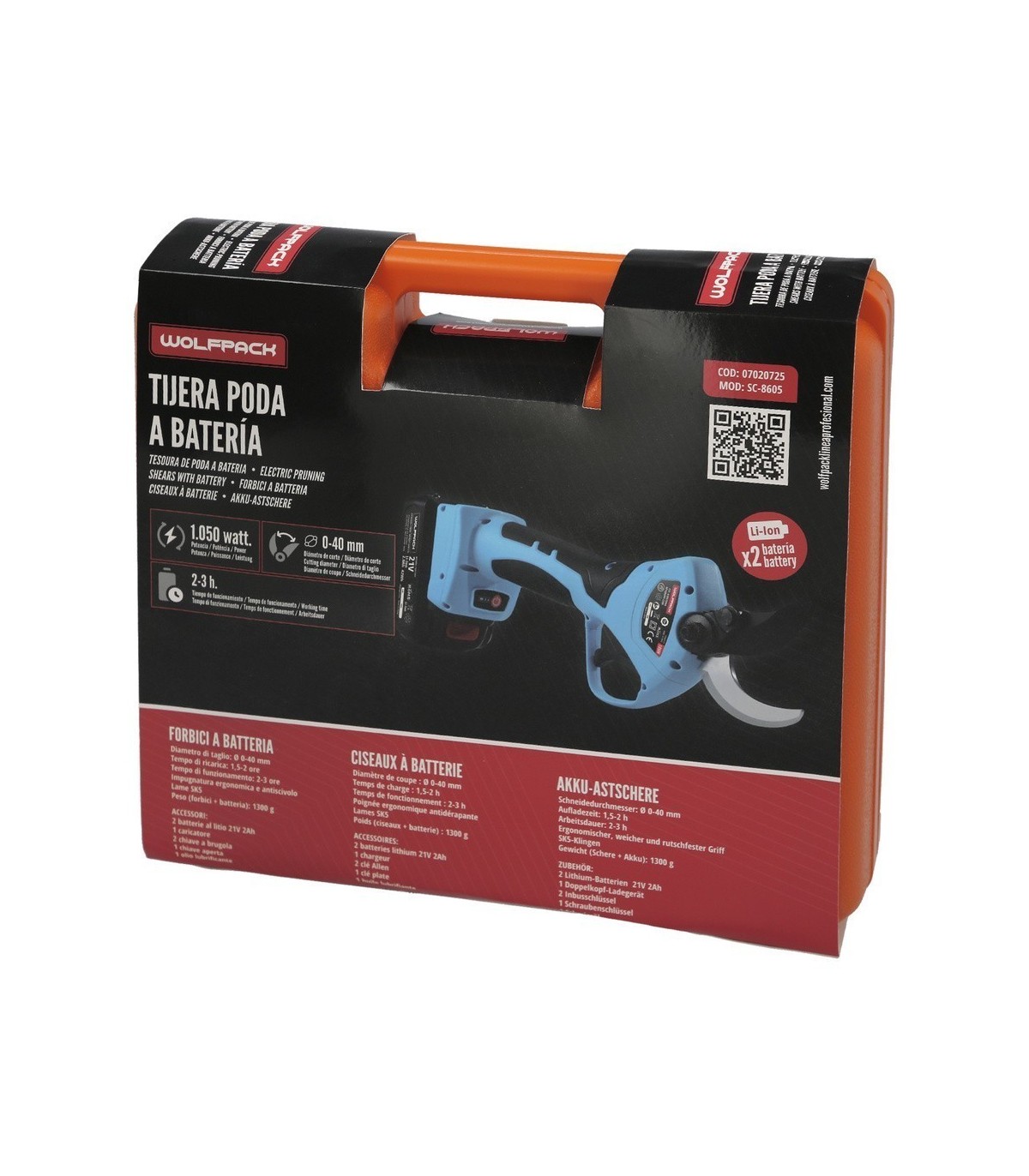 Tijera de podar eléctrica a batería 21V/2Ah con motor de 1050W, capaz de cortar ramas de hasta 40 mm. Incluye dos baterías, maletín y accesorios. Ideal para jardinería profesional y doméstica.